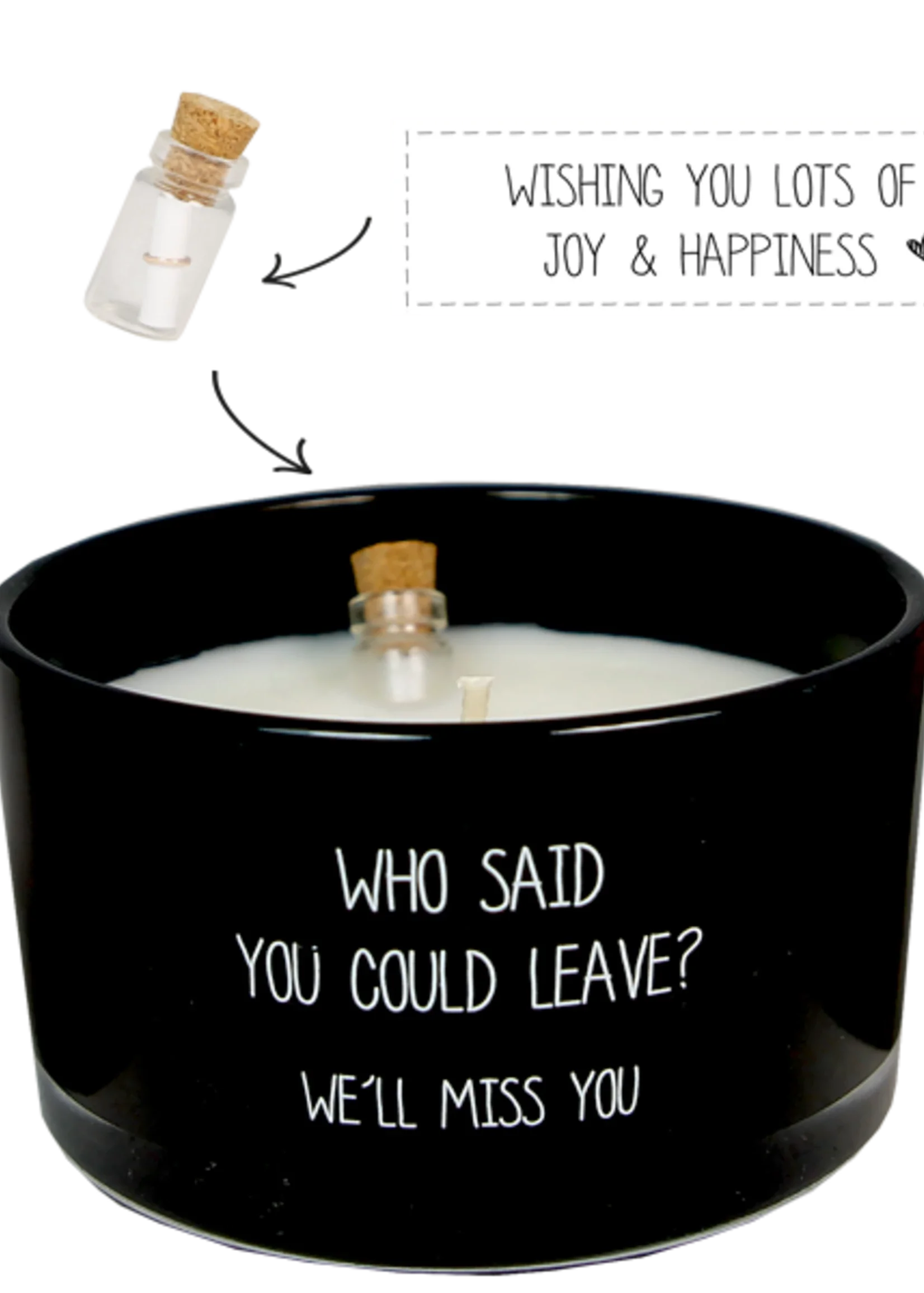 Op de geurkaars staat 'Who said you could leave? We'll miss you'. In de wax vind je een flesje met daarin een briefje. Voordat je de kaars brandt kan je het flesje uit de wax trekken, de kurk van het flesje en het briefje eruit halen. Op het briefje staat 'Wishing you lots of joy and happiness'. Een mooi cadeau met een leuk complimentje voor iemand die op reis gaat.